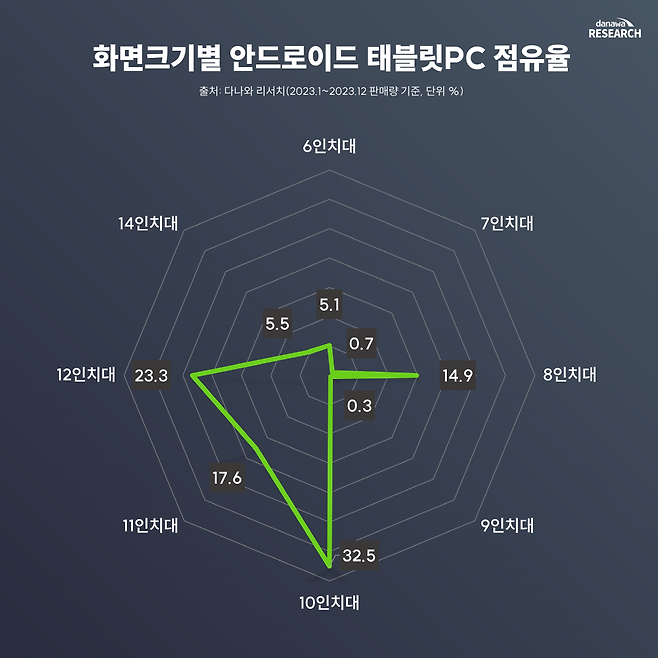 하지만 소비자들이 선호하는 크기는 주로 10~12인치대다. 10인치대(32.5%). 12인치대(23.3%), 11인치대(17.6%) 순이며 이들이 전체의 약 70%가량을 차지한다. 휴대성을 더 중요하게 여기는 소비자들의 선택은 주로 8인치대(14.9%)에 몰리며, 스마트폰과 사이즈가 거의 같은 6인치대는 5.1%. 노트북에 버금가는 14인치대는 5.5%로 점유율이 높지 않다.