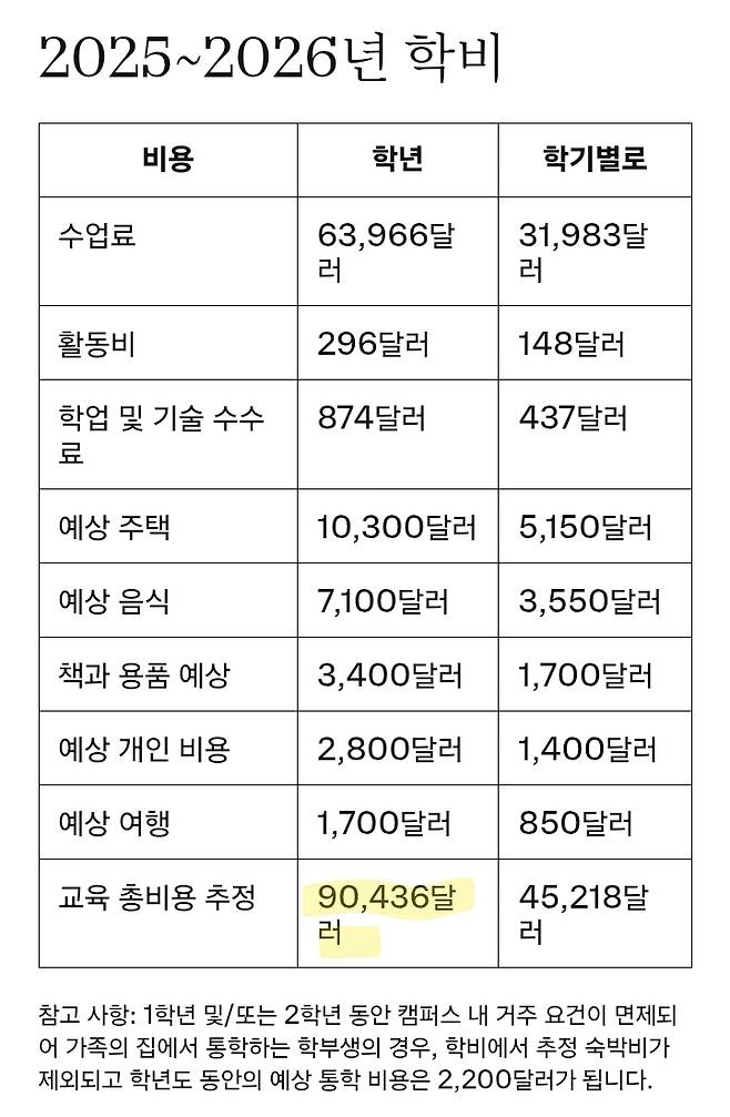 기본 학비+기숙사+식사가 7800불정도임