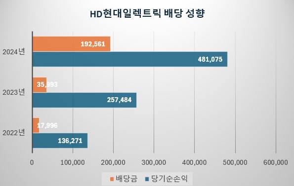 HD현대일렉트릭은 2017년 한국조선해양에서 분리된 후 6년 만인 2023년 첫 배당을 시행했다. 직전까지는 영업악화로 여윳돈이 부족했으나 2022년 손익구조가 플러스로 돌아서면서 여력이 생긴 것이다.