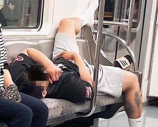 지하철 안에서 좌석 3칸을 차지한 채 발을 들어 올리고 자는 문신 남성의 사진이 공분을 일으켰다.
