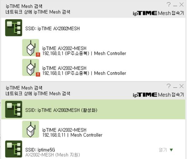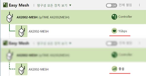 ipTIME Mesh 접속기를 이용하면 유/ 무선 네트워크에 연결된 이지 메시 지원 장비들을 한 눈에 확인할 수 있다. 상단은 컨트롤러 유닛을 PC에 연결한 상태에서 유선 백홀을 구성한 경우고, 하단은 무선(와이파이)로 연결된 경우다.
