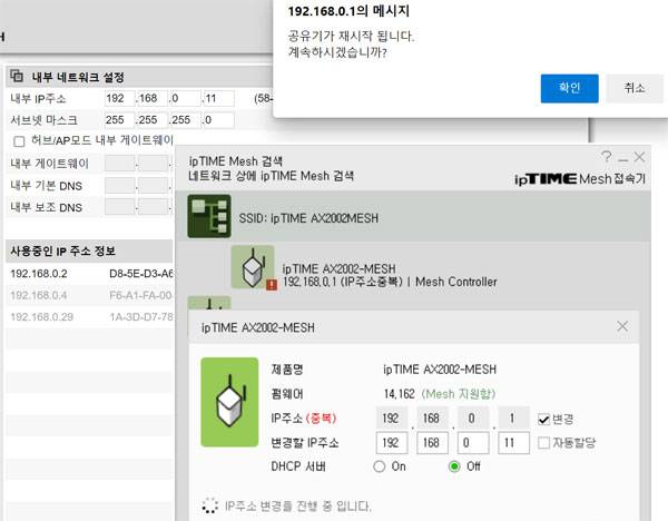 유선 연결의 경우 공유기의 기본 IP 주소가 동일하게 세팅되어 있어 충돌이 발생하니 itTIME Mesh 접속기에서 내부 IP 주소가 겹치지 않도록 변경하거나, PC에 직접 연결된 장비의 관리자 페이지에서 내부 IP 주소를 변경해 주어야 한다. 무선 백홀로 이지 메시를 구성한다면 본 과정은 건너뛸 수 있다.