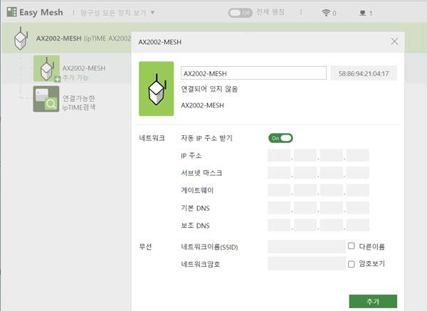 이때 에이전트 유닛을 더블클릭하면 뜨는 팝업 창에서 '추가'를 클릭하면 자동으로 이지메시 구성이 진행된다. 무선 백홀일 경우 중간에 WPS 버튼을 클릭해 연결해주어야 하지만, 유선 백홀 구성은 WPS 버튼 클릭없이 자동 구성된다.
