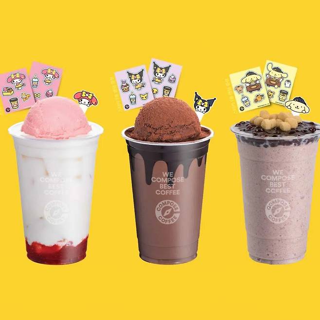 컴포즈커피와 산리오캐릭터즈가 여름 한정 콜라보 메뉴 3종과 굿즈 6종을 선보였다. 마이멜로디, 쿠로미, 폼폼푸린 세 캐릭터가 메인이다. 팥절미 밀크쉐이크, 딸기생초콜릿라떼, 생초콜릿라떼를 주문하면 캐릭터 초콜릿이 올라간 음료와 랜덤 스티커를 받을 수 있고 굿즈는 4,000원 이상의 메뉴 주문 시 구매할 수 있다.