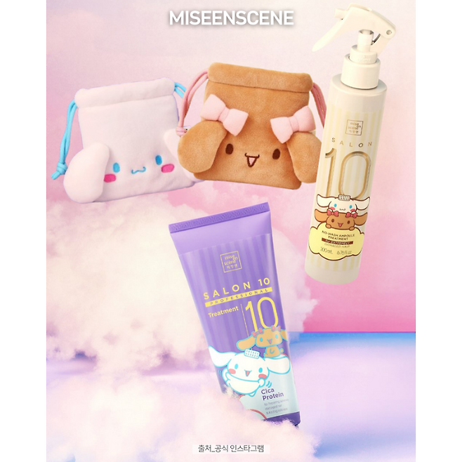 미장센 살롱10 노워시 트리트먼트와 살롱10 시카프로틴 트리트먼트 기획 세트에 들어간 시나모롤과 모카 파우치!