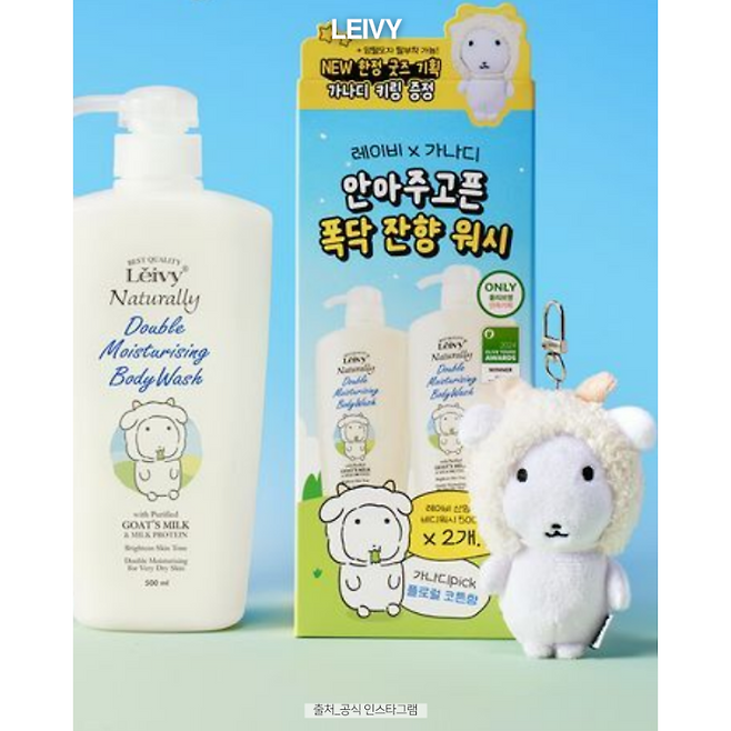 레이비를 찾아온 귀여운 깜짝 손님의 정체는 바로 가나디! 가나디의 매끈피부 비결 한정판 가나디 케어세트는 본품으로 레이비 산양유 바디워시 500ml 2개입+ 증정으로 모자 탈부착 가능한 가나디 봉제키링까지!
