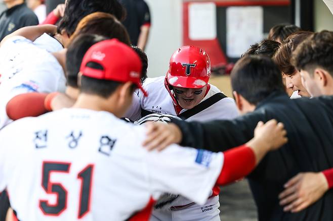 다른 투수도 아니고 KT 마무리 박영현을 상대로 펜스를 직격한 김규성은 2루에 이어 3루를 돌아 홈까지 내달렸다. 6-4를 만든 극적인 홈런이었다. 기쁨의 순간이 짧기는 했다.
