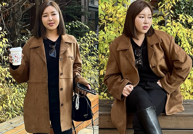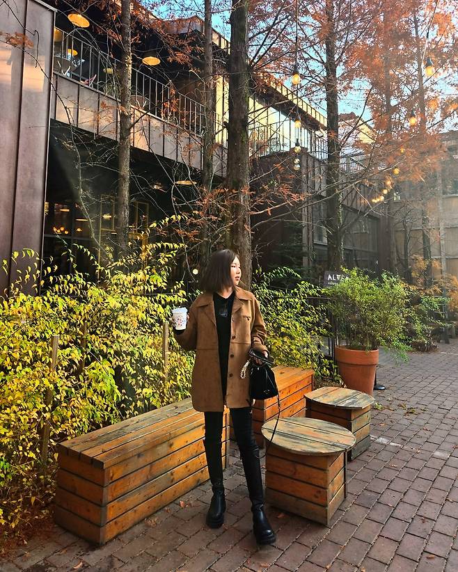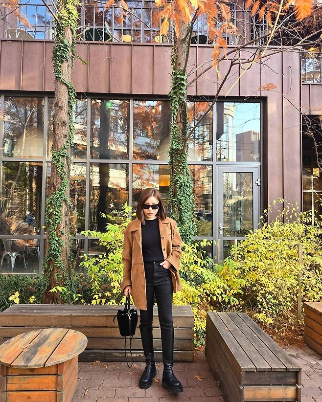 사진 속 송가인은 브라운톤의 코트에 검정색 가죽 롱부츠를 코디해 세련되면서 시크한 무드를 연출했습니다.