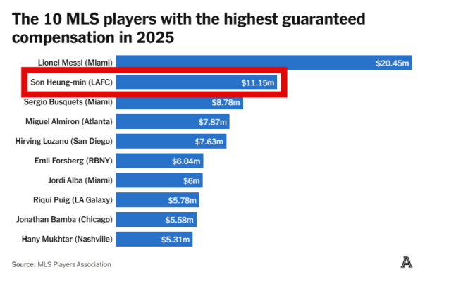 보고서에 따르면, MLS 전체에서 손흥민보다 높은 연봉을 받는 선수는 메시뿐이다.