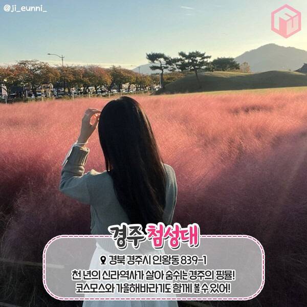 천 년의 신라 역사가 살아숨쉬는 경주의 첨성대는 봄에는 벚꽃, 여름에는 해바라기, 가을에는 핑크뮬리가 만발해 매 계절마다 새롭게 고즈넉한 풍경이 펼쳐지는 핑크뮬리 명소입니다. 첨성대 일원에 넓게 펼쳐지는 꽃밭 가득 핑크뮬리 너머 보이는 첨성대는 고고하면서도 신비롭게 다가오는데요.