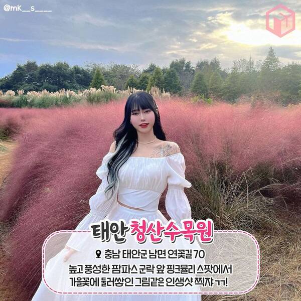 특히 10월에 태안 청산수목원을 방문하면 가장 싱그러운 색감의 팜파스와 핑크뮬리의 조화를 볼 수 있습니다. 키가 크고 풍성한 깃털같은 잎을 가진 팜파스 군락 앞, 부드럽고 풍성한 분홍빛의 핑크뮬리 군락에 더할나위 없이 완벽한 가을 정취를 만끽하기 좋죠. 약 600여종의 나무들이 선사하는 가을 단풍의 향연까지 볼 수 있으니 꼭 10월에 방문해보시길 바랍니다.