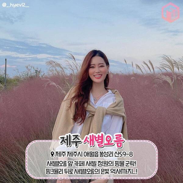 은빛의 억새가 일렁이는 풍경이 유명한 제주 새별오름은 최근 핑크뮬리 명소로도 입소문을 타고 있습니다. 사실 새별오름 핑크뮬리는 오름 바로 앞의 카페 '새빌'에 방문해야 가까이에서 볼 수 있습니다. 새별오름의 정상부에서는 카페 주위를 둘러싸고 있는 핑크뮬리 군락을 멀리서 감상할 수 있죠.