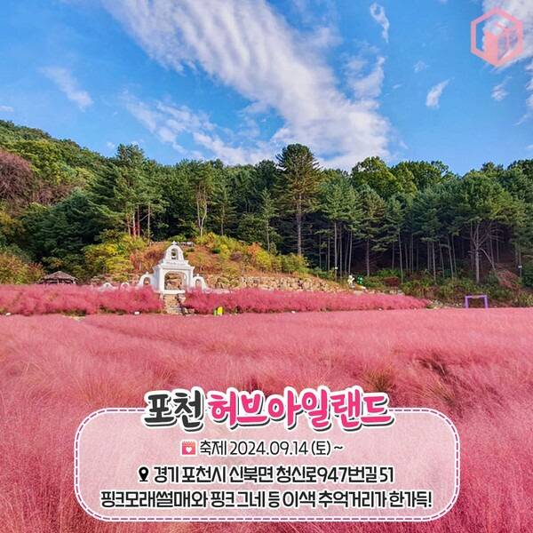 서울 근교 포천 허브아일랜드는 사계절 다채로운 계절꽃 축제가 열려 언제가도 좋은 여행지입니다. 매년 가을이 되면 허브아일랜드의 가장 끝자락, 스카이 허브팜의 드넓은 벌판을 부드러운 핑크뮬리가 가득 채워 장관을 선사하는데요. 핑크뮬리 밭 뒤로 이국적인 하얀색 건물과 핑크색 언덕, 각종 포토존이 설치되어 있어 추억을 다양하게 기록하기 좋습니다.