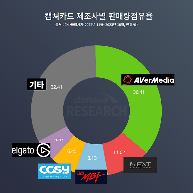 사실 시장이 어려워지고 판매량이 줄어들 때 소비자들의 보수적인 성향이 더 강화되는 경향이 있다. 굳이 대중화되지 않은 새로운 선택지보다는 안전한 선택지라 볼 수 있는 유명한 제품군을 고르는 것이다. 그런 관점으로 보면 현재 캡쳐카드 시장을 보면 사실상 묻지마 에버미디어의 독무대다. 점유율이 약 36% 수준인데 오랫동안 이 점유율을 꾸준히 유지 중이다. 그나마 경쟁자라 볼 수 있는 건 엘가토였다. 엘가토가 국내 시장에 진입한 직후에는 살짝 인기가 있었지만 힘이 빠진 현시점에서는 다시 에버미디어 천하로 돌아갔다.
