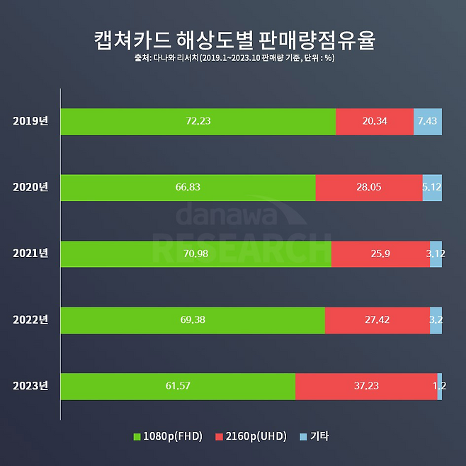 영상 캡쳐카드 해상도별 판매량 점유율만 보면 정말로 모 아니면 도라는 소리가 나온다. 주력 제품군 해상도는 FHD or 4K로 진짜로 중간(QHD)이 없다. 2019년에는 FHD 정도로도 충분했고 4K 캡쳐카드는 점유율이 대략 20% 정도에 불과했다. 그러나 4K 캡쳐카드의 점유율은 슬금슬금 증가했고, 결국 2023년에는 37%까지 상승했다.