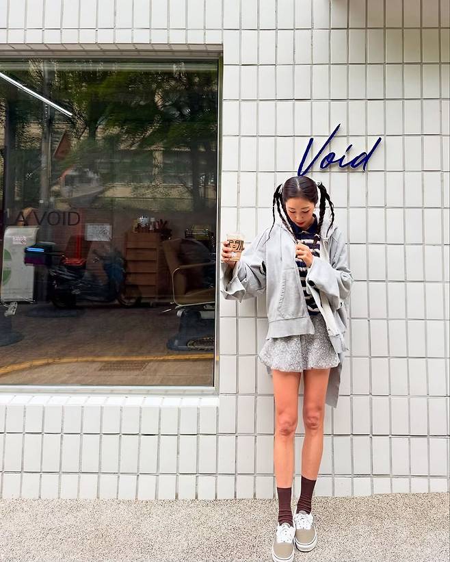 하의는 포근한 니트 질감의 그레이 쇼츠로, 하의 실종 느낌을 적절히 살려 다리 라인을 강조했다. 여기에 무릎 아래까지 올라오는 브라운 삭스와 베이지 톤의 캔버스 스니커즈를 더해 빈티지한 스트리트 무드를 완성했다. 특히 브라운 삭스는 전체 착장에 따뜻한 포인트가 되어주며, 꾸안꾸 스타일링의 센스를 엿볼 수 있다.