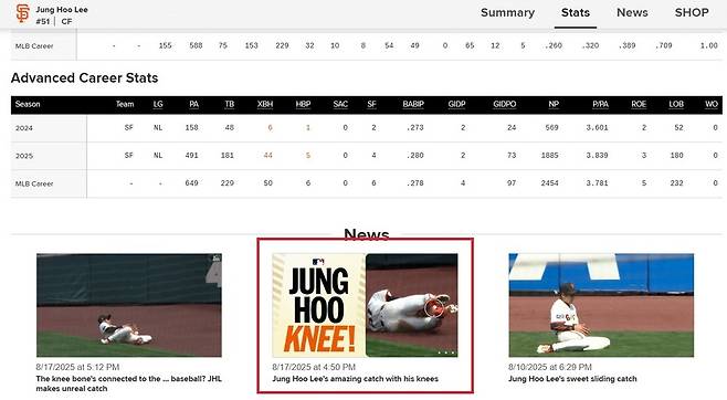 ‘정후KNEE’ 이정후의 무릎캐치, SF 중계진 “올해의 수비? 이건 10년의 수비” 극찬