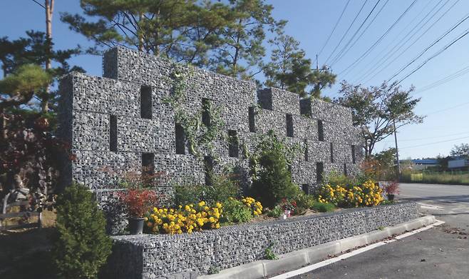 개비온(GABION)은 ‘돌망태 옹벽’으로 철사를 꼬아 만든 망태 안에 돌을 채워 넣어 만든구조물이다. 개비온은 견고함이 뛰어나고 안전성이 높아 화재나 배수에 강한 것이 장점이다. 자재의 유연성이 좋아 설치와 보수가 쉽고 수명이 길어 별도의 유지관리가 필요하지 않아 편리하다. 활용되는 석재에는 개비온석, 현무암, 자연석 등이 있으며 철망도 스테인리스, 컬러도징 등 망태의 모양에 따라 다양한 형태로 자유롭게 구현할 수 있다. 꼭 전문가의 손을 빌리지 않아도 셀프 부분 수리가 가능해 비용 측면에서 경제적이고 무엇보다 재활용이 가능해 친환경적이다. 하지만 시공 인건비가 높고 시공 기간이 길어 섬세한 계획을 필요로 하며 자재 종류에 따라 비용 폭이 크게 뛰는 편이다.
