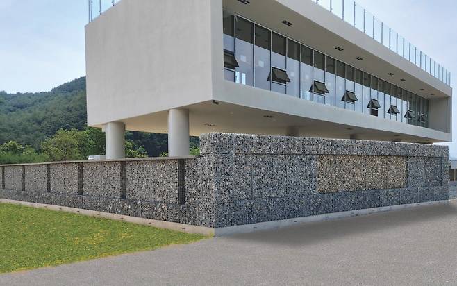 개비온(GABION)은 ‘돌망태 옹벽’으로 철사를 꼬아 만든 망태 안에 돌을 채워 넣어 만든구조물이다. 개비온은 견고함이 뛰어나고 안전성이 높아 화재나 배수에 강한 것이 장점이다. 자재의 유연성이 좋아 설치와 보수가 쉽고 수명이 길어 별도의 유지관리가 필요하지 않아 편리하다. 활용되는 석재에는 개비온석, 현무암, 자연석 등이 있으며 철망도 스테인리스, 컬러도징 등 망태의 모양에 따라 다양한 형태로 자유롭게 구현할 수 있다. 꼭 전문가의 손을 빌리지 않아도 셀프 부분 수리가 가능해 비용 측면에서 경제적이고 무엇보다 재활용이 가능해 친환경적이다. 하지만 시공 인건비가 높고 시공 기간이 길어 섬세한 계획을 필요로 하며 자재 종류에 따라 비용 폭이 크게 뛰는 편이다.