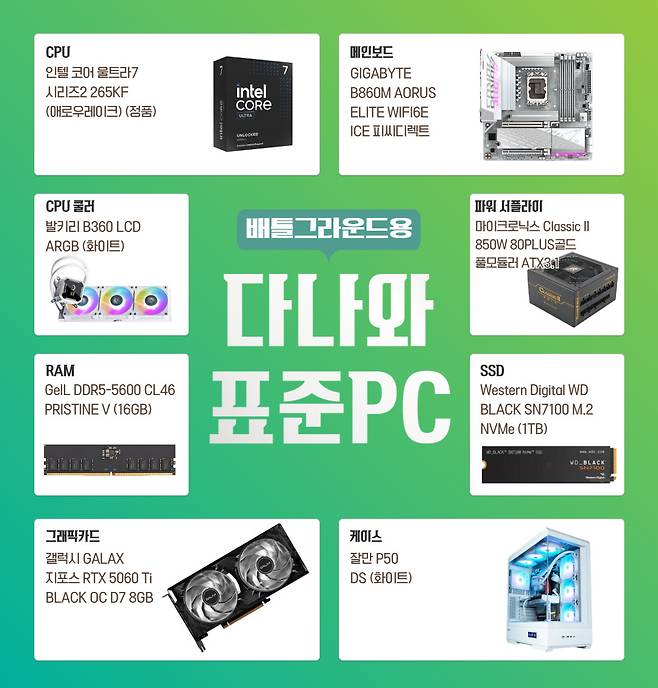 다나와가 제시하는 7월의 배틀그라운드용 표준PC가 바로 그러한 제품이 아닐까 한다. 현재 PC 시장에서 인기 있는 인텔 프로세서를 필두로 최근 출시돼 화제를 모으고 있는 엔비디아 지포스 RTX5060 Ti 그래픽카드와 고성능 메모리를 탑재해 고사양 게임도 무리 없이 구동할 수 있다.