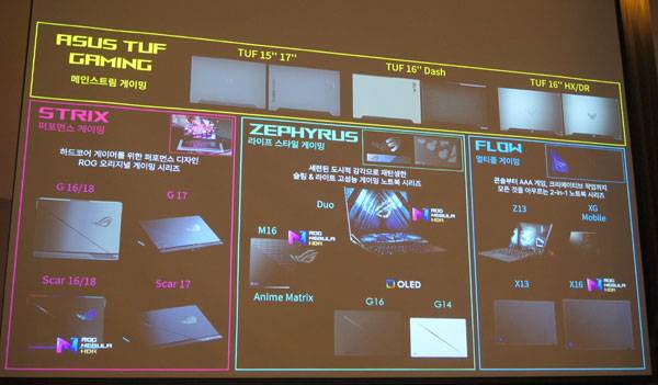 이어서 코어 울트라 기반 게이밍 제품군인 ASUS TUF와 STRIX, ZEPHYRUS, FLOW 시리즈를 발표했다. 특히 이번 제품군에는 게이밍 제품군이라면 이정도 디스플레이는 되어야 한다는 자체적인 기준을 세운 ROG NEBULA 디스플레이를 적극 탑재한 것이 특징이다.