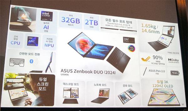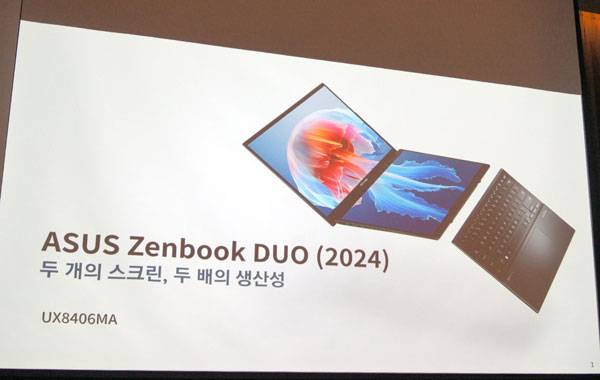 금일 행사에서 가장 먼저 발표된 젠북 듀오는 올해 초 국제 전자제품박람회 CES 2024에서 최초 공개되었던 제품으로, 2개의 14인치 OLED 터치스크린과 탈부착형 블루투스 키보드로 구성되어 다양한 활용성과 높은 이동성을 갖춘 것이 특징이다.