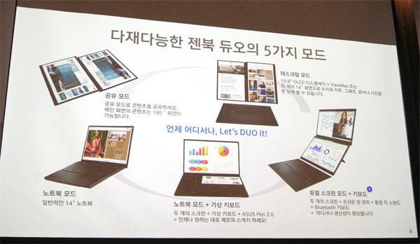 두 개의 스크린, 두 배의 생산성이라는 캐치프레이즈 아래 발표된 젠북 듀오는 2018년 부터 이어진 에이수스의 듀얼 스크린 리더십을 이어받은 제품으로, 일반적인 노트북 모드, 블루투스 키보드없이 한쪽 화면에 가상 키보드를 띄우는 노트북 모드 + 가상 키보드, 듀얼 스크린 모드, 19.8" OLED 디스플레이 또는 두 개의 14" 화면으로 생산성을 높일 수 있는 데스크탑 모드, 동일한 화면을 맞은편 화면에 180° 회전시켜 보여주는 공유 모드의 다섯 가지 모드를 지원한다.