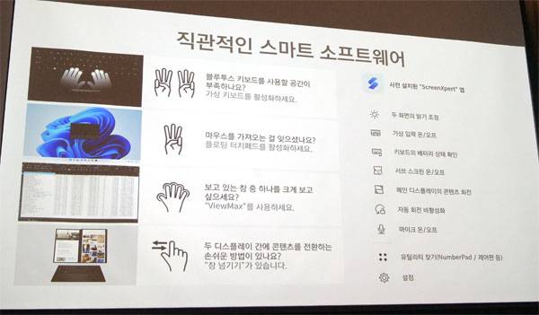 고품질 디스플레이는 ScreenXpert 소프트웨어와 직관적인 제스처 인식 기능을 지원해 편리하게 활용할 수 있다. ScreenXpert는 손쉬운 앱 전환, 창 관리 등을 돕는 소프트웨어로 효율적인 멀티태스킹 환경을 제공하며, 간단한 손가락 제스처만으로도 가상 키보드 실행, 창 최대화 등의 작업을 수행할 수 있다.