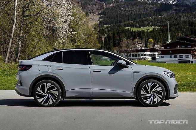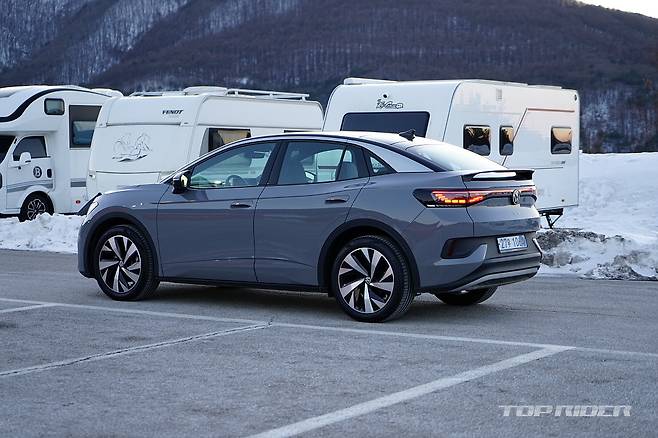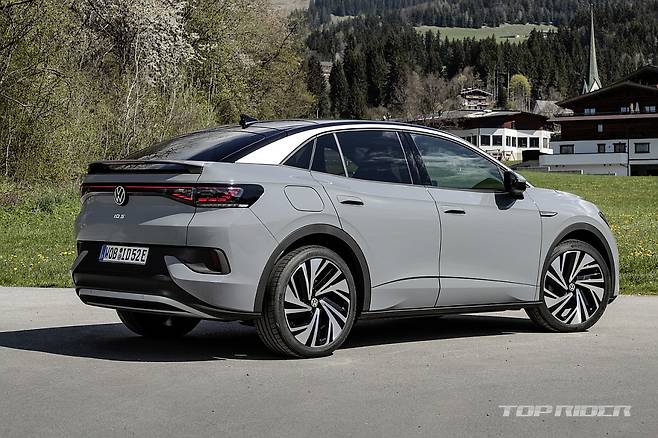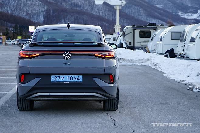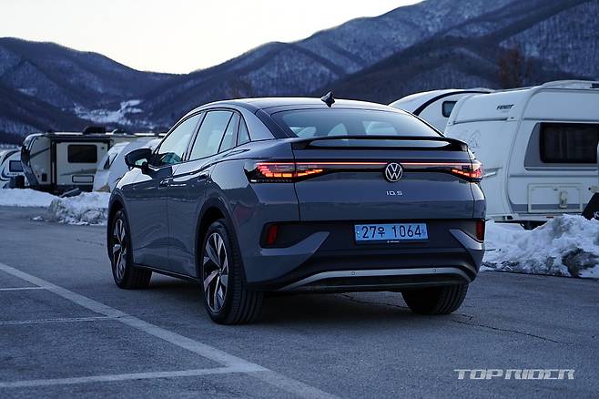 ID.5의 차체 크기는 전장 4600mm, 전폭 1850mm, 전고 1620mm, 휠베이스 2765mm다. ID.4 대비 15mm 늘어난 전장과 5mm 낮은 전고를 확보했다. ID.4의 경우 뒤쪽이 다소 무거워 보였다면, ID.5는 이런 무게감을 덜어내 경쾌한 프로포션이다. 리어 뷰로 보이는 스포일러는 셀링 포인트다.