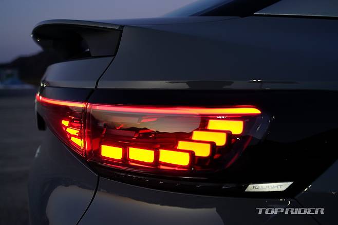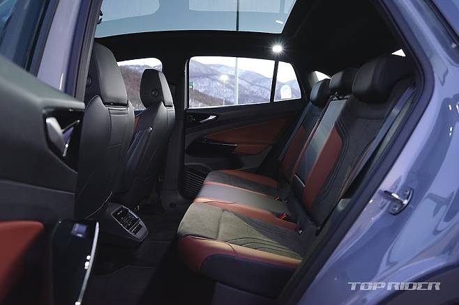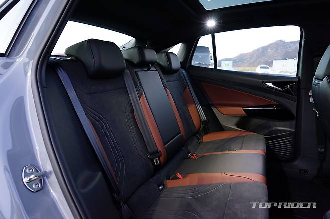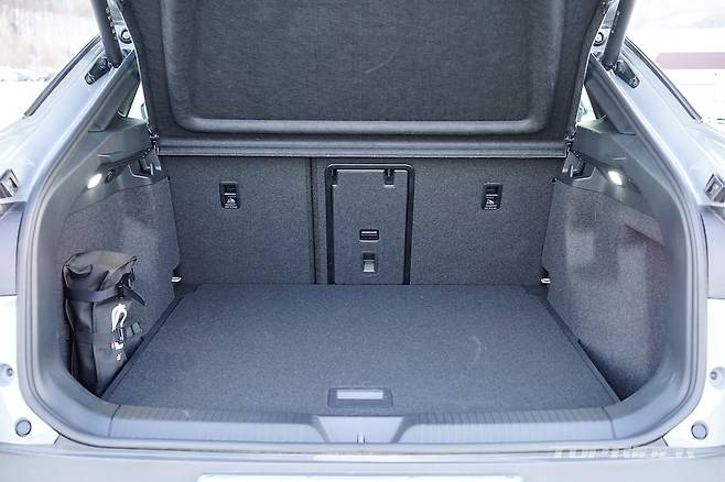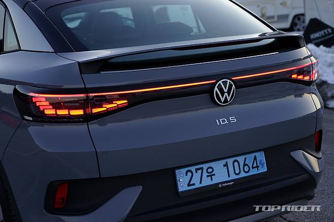 후면부 디자인은 일체형 스포일러와 완만한 루프라인을 통해 완전히 다른 느낌을 전한다. 양산차에서는 오랜만에 적용된 보디 일체형 스포일러는 공기역학 성능을 높여준다. ID.5는 쿠페형 실루엣을 선택했지만, 트렁크 공간의 실사용 체적이나 2열 헤드룸에서 ID.4와 큰 차이가 없다.
