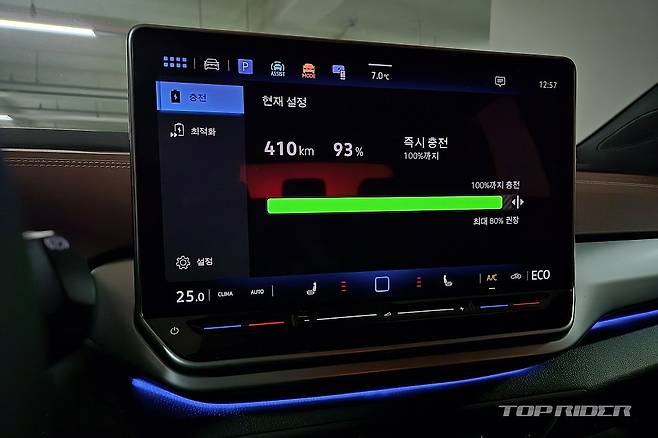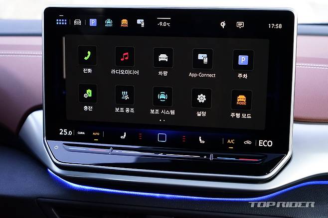 특히 인상적인 부분은 공조장치에 발 보온, 손 보온 등 공조관련 운전자의 주요 요구사항을 아이콘으로 따로 배치한 점이다. 겨울철 동승자가 손이나 발이 춥다고 하면 집중적인 공조 조작이 가능하다. 히터가 약했던 초기형 전기차와 달리 영하 15도 내외의 추운 날씨에도 차안은 따뜻했다.
