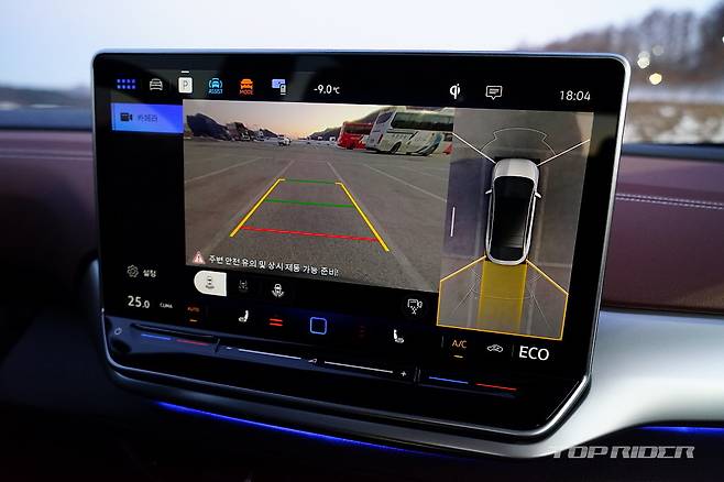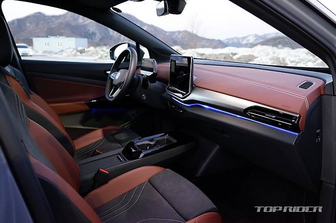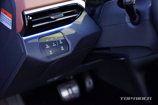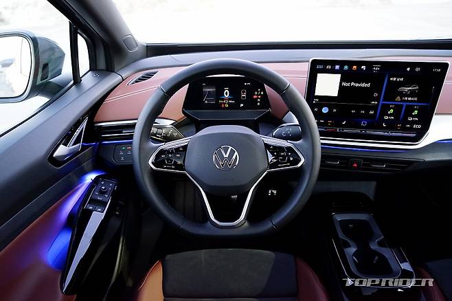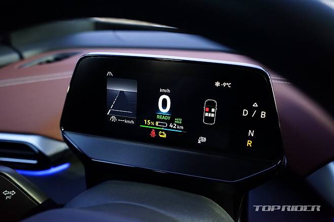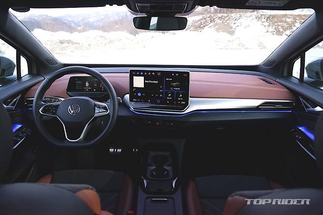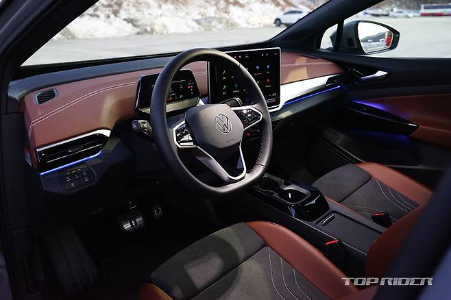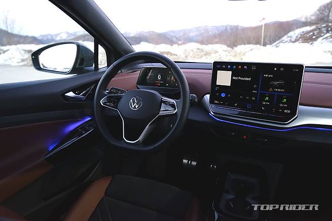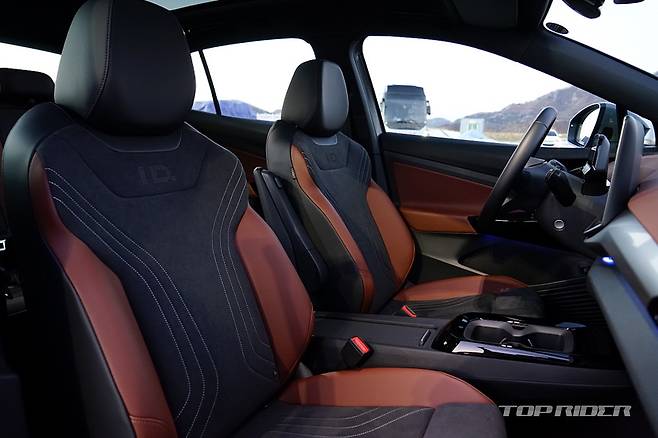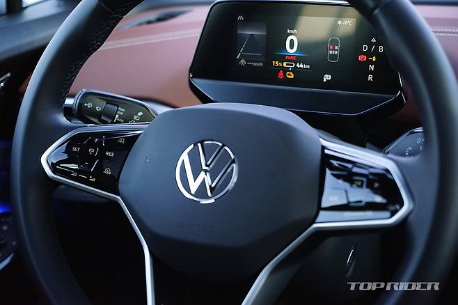 운전석에서의 시트포지션은 안정적이다. 내연기관 기반 전기차나 일부 전기차가 차체 하단부 배터리팩으로 인해 바닥이 높게 느껴지는 것과는 다른 설정이다. 시트포지션의 중요성을 강조하는 폭스바겐 다운 모습이다. 전방은 물론 후방과 사이드미러까지 넓은 시야를 확보한 모습이다.