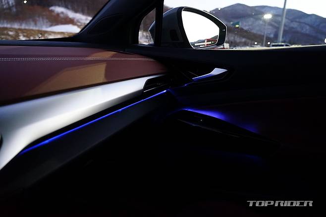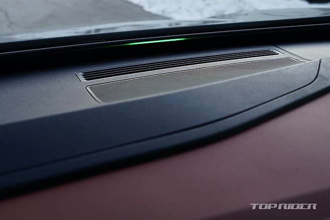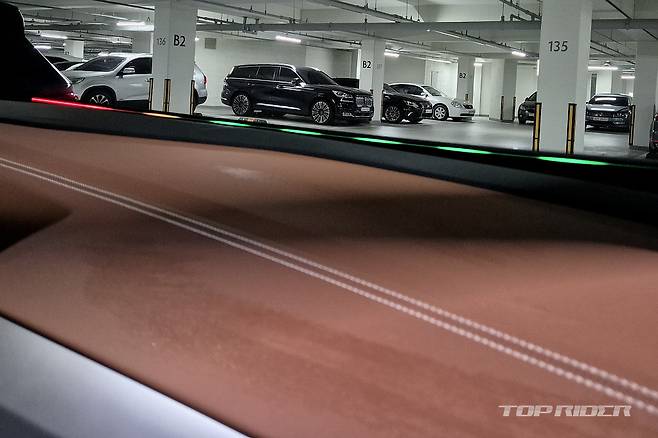 대시보드 중앙에는 12.9인치 디스플레이가 위치하는데, UI와 UX가 기존과는 다르다. 시인성과 조작 편의성이 향상된 것과 함께 쨍한 모습으로 해상도가 좋아졌다. 보이스 어시스턴트 IDA가 탑재될 예정인데, 대부분의 조작이 음성으로 가능하다. 윈드실드 하단 LED 바의 역할이 커보인다.