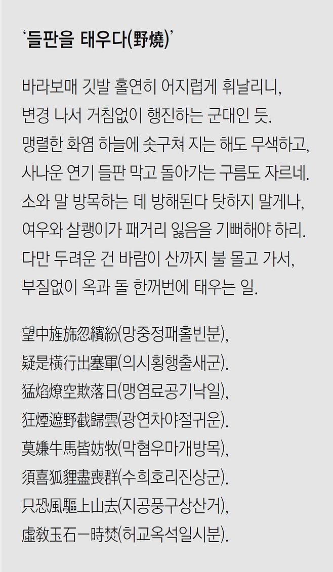 불태운다는 메타포를 활용한 한시를 만나기란 쉽지 않다. 당시 중에선 태워도 태워도 들풀처럼 다시 돋아나는 이별의 슬픔을 포착한 백거이의 시가 유명하다.(‘賦得古原草送別’) 당나라에서 활동한 최치원(崔致遠·857∼?)이 들불을 보며 떠올린 것은 백거이와는 사뭇 다른 국면이었다.