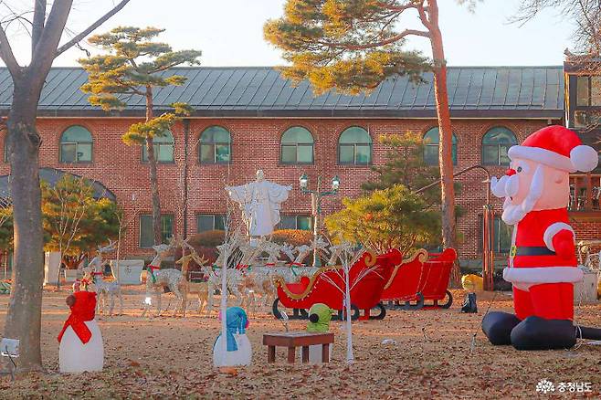 성당 입구를 따라 들어서면 산타와 루돌프, 눈사람 장식으로 꾸며진 크리스마스 포토존이 방문객을 맞이합니다. 낮에는 밝은 분위기, 밤에는 은은한 조명과 함께 또 다른 느낌을 전해줍니다. 이와 함께 주목할 부분은 성당 곳곳에 자리한 보호수입니다.