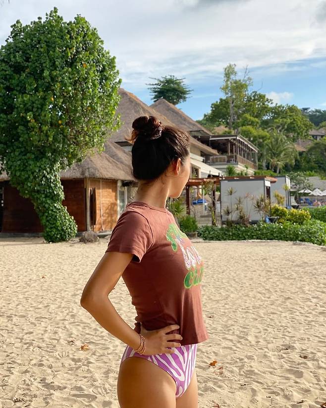 특히 상의는 허리를 살짝 덮는 길이의 크롭 티셔츠로, 지나치게 과하지 않으면서도 허리 라인을 살짝 노출해 여름 휴양지 감성을 극대화했다. 반면 하의는 다리 라인을 길어보이게 하는 하이컷 스타일로 선택해, 전체적인 실루엣을 길고 탄탄하게 연출했다. 시크하면서도 건강한 매력이 돋보이는 룩이다.
