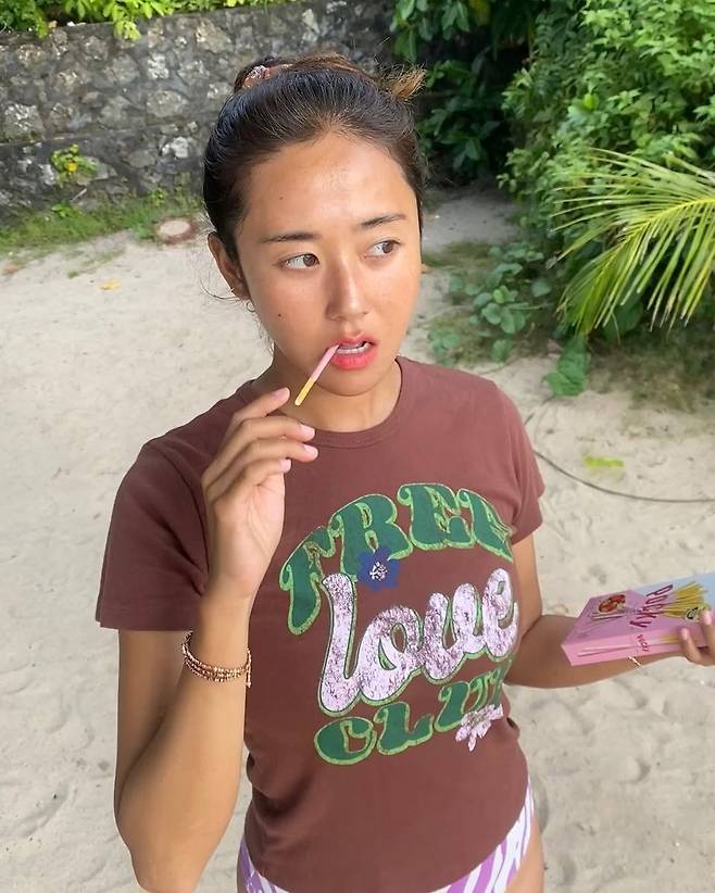 사진 속 허가윤은 자줏빛 브라운 컬러의 레터링 반팔 티셔츠를 입고, 하의는 연보라와 화이트 컬러의 얼룩무늬 비키니를 매치했다. 언뜻 보면 무심한 듯한 조합이지만, 오히려 이 과감한 믹스매치가 그녀만의 자유로운 분위기를 배가시킨다. 바닷가의 자연적인 돌담과 모래, 풍성한 나무 배경까지 더해져 전체적인 화보 느낌을 완성한 점도 눈에 띈다.