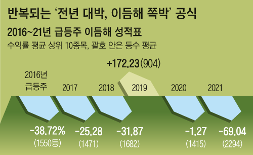 ‘산이 높으면 골도 깊다’는 말이 국내 증시에서 매년 반복되고 있다. 그해 가장 많이 오른 종목을 샀던 투자자들이 다음 해 쓴맛을 보는 패턴이 이어지고 있다. 테마주들이 기승을 부리고, 시장의 쏠림 현상이 커서 주가가 치솟았던 급등주들이 다음 해에는 급락주 신세가 되는 일이 많기 때문이다.