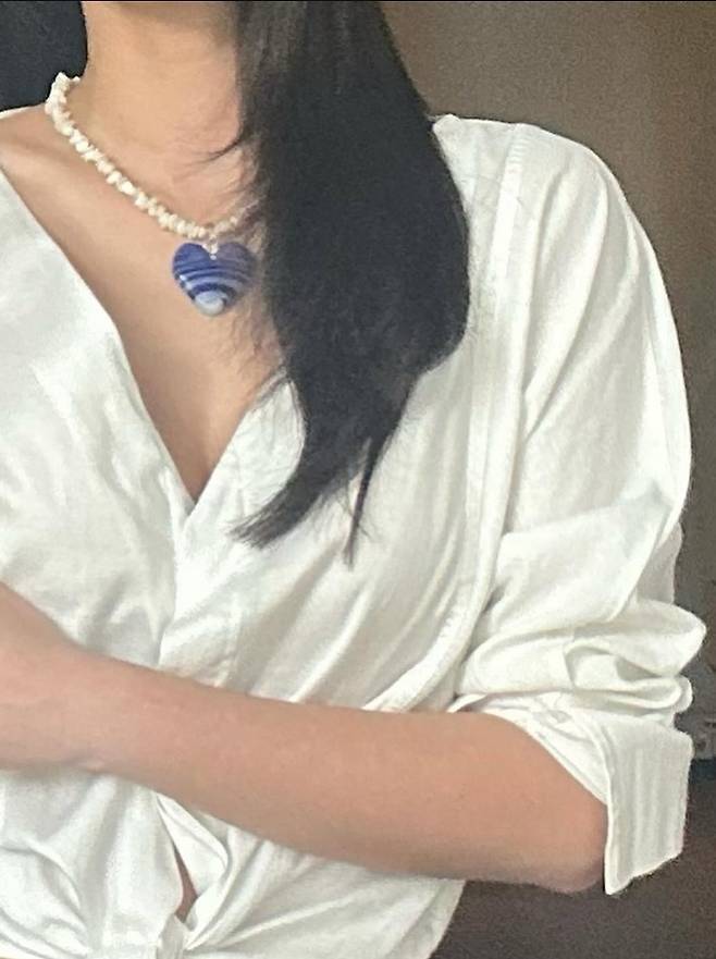 여기에 블루 하트 펜던트 목걸이까지 더해 전체적인 무드를 단숨에 청량하게 만들었습니다.