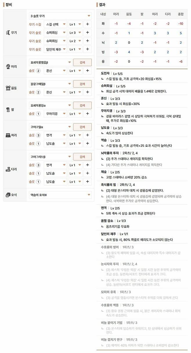투구깨기의 경우, 반복 사용 시 화력 고점이 높지만 연기해방 무쌍베기 연계 시 코팅이 2단계나 내려가 관리에 대한 부담이 생길 수 있다. 그래도 집중 약점 공격을 이용하면 코팅 수급이 용이해지는 편인데, 상처에 집중 찌르기[무진] 사용 뒤 기인베기3, 기인 큰회전베기까지 성공하면 내려간 코팅 등급을 복구할 수 있으니 낭만과 화끈한 전투를 원한다면 도전해 보자.