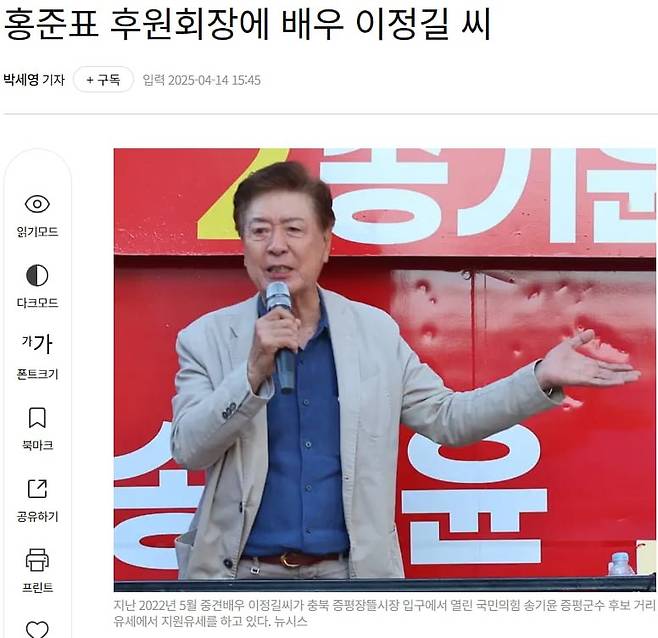 홍준표 전 대구시장이 14일 오후 대선 출마를 공식 선언한 가운데 대선 경선 캠프 후원회장에 배우 이정길(81) 씨가 확정된 것으로 알려졌다.
