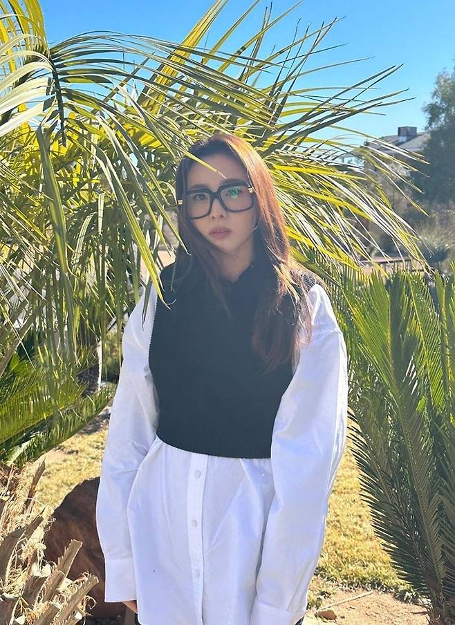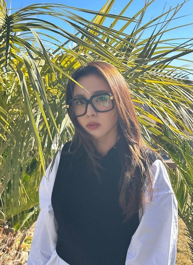공개한 사진에서 산다라박은 커다른 검은 뿔테 안경을 쓰고 화이트 셔츠에 블랙 베스트의 코르셋룩으로 지적이면서도 청순한 분위기를 완성했다.
