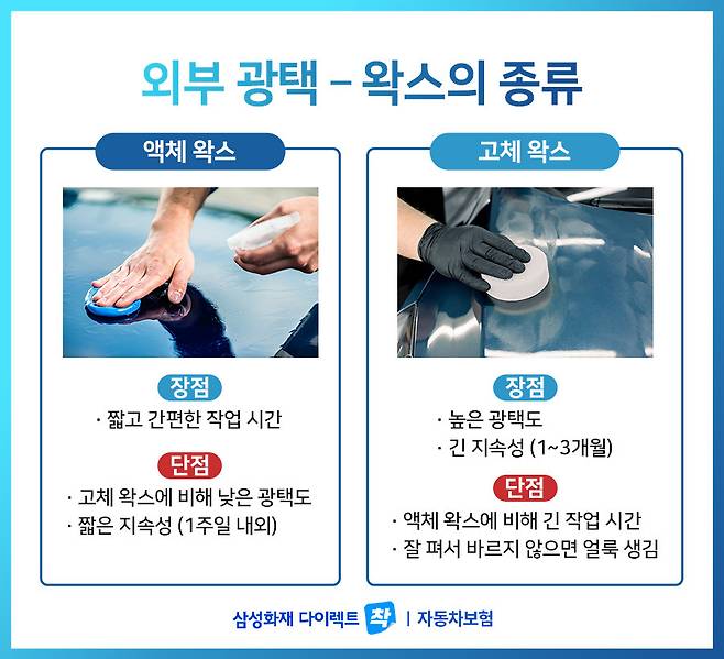 먼저 자동차 외관 광택을 알아보겠습니다. 사용하는 왁스의 제형에 따라 크게 액체 왁스와 고체 왁스로 나눕니다.