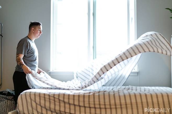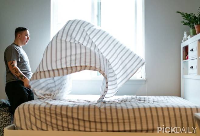 아침에 일어나면 이불을 똑바로 정리하지 말고, 한켠에 뒤집어 젖혀두는 것이 오히려 좋다. 외관상으론 지저분해도 건강엔 더 좋은 방법이다. 최소 30분~1시간 정도 통풍시킨 뒤 개는 게 좋다. 침대 시트와 이불 사이에 공기가 통하면서 습기가 빠져나간다.
