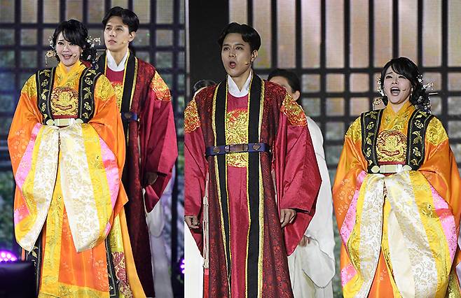 뮤지컬배우 김소현 손준호 부부가 21일 오후 서울 경복궁 흥례문 광장에서 열린 ‘2024 코리아 온 스테이지’ 공연에 참석했습니다.