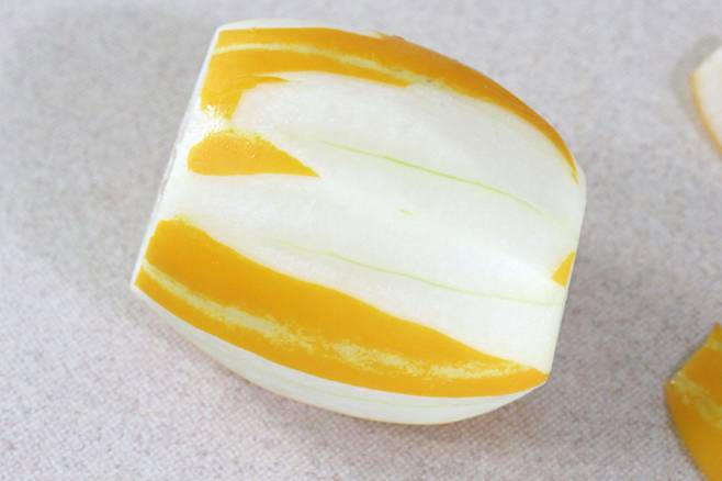 참외를 깨끗이 씻은 뒤, 필러로 껍질을 군데군데 벗겨주세요.