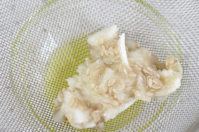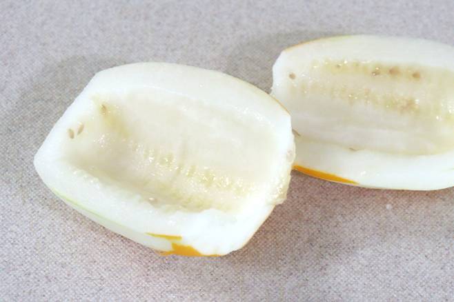 참외를 반으로 잘라 속을 파낸 뒤, 파낸 속은 따로 모아주세요