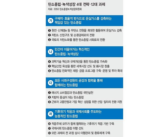 이날 탄녹위는 ▲책임있는 실천 ▲질서있는 전환 ▲혁신주도 탄소중립·녹색성장을 3대 정책 방향으로 삼고 4대 전략과 12대 과제를 제시했습니다. 4대 전략 및 12대 과제에는 원전과 신재생에너지 등 무탄소 전원을 최대한 활용한 온실가스 감축, 저탄소 산업구조 및 순환경제로 전환, 국토의 저탄소화를 통한 탄소중립 사회로 전환, 과학기술 혁신과 규제개선, 에너지 소비절감과 국민실천, 지방이 중심이 되는 산소중립 등 국제사회 탄소중립 이행 선도 등이 포함됐습니다.