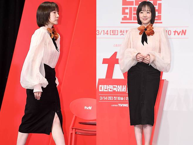 임수정은 시스루 블라우스와 블랙 스커트 조합으로 단아하면서도 우아한 포멀룩을 완성했습니다.