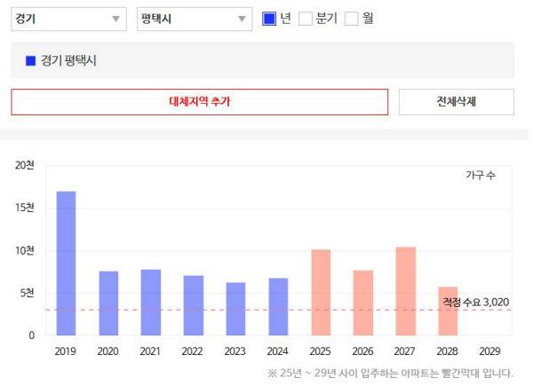 평택 아파트 가격이 좀처럼 회복하지 못하는 가장 큰 이유는 꾸준히 공급 물량이 많아서다. 대규모 공급 앞에 가격 방어선이 와르르 무너졌다. 평택의 경우 화양지구·브레인시티를 중심으로 2028년까지 입주 물량이 2만3000여 가구 예정돼 있다. 대개 신축 아파트 입주는 일대 전세 시세를 낮춘 뒤 매매가에도 영향을 준다.